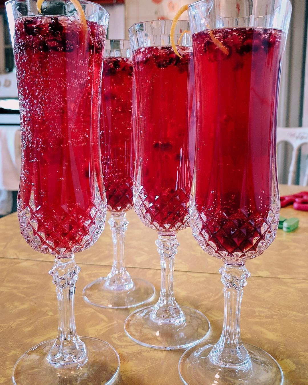 - Top off the rest of the glass with champagne and garnish with some pomegranate seeds.