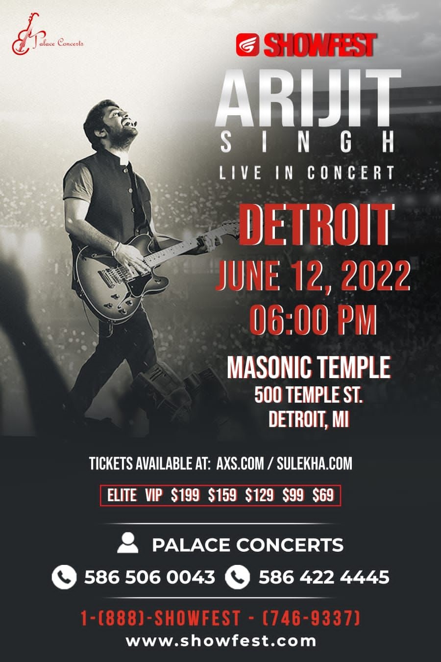 Palace Concerts & Showfest presents Arijit Singh Live In Concert on June 12, 2022 at 6 PM in Detroit Masonic Temple, Michigan U.S.A.