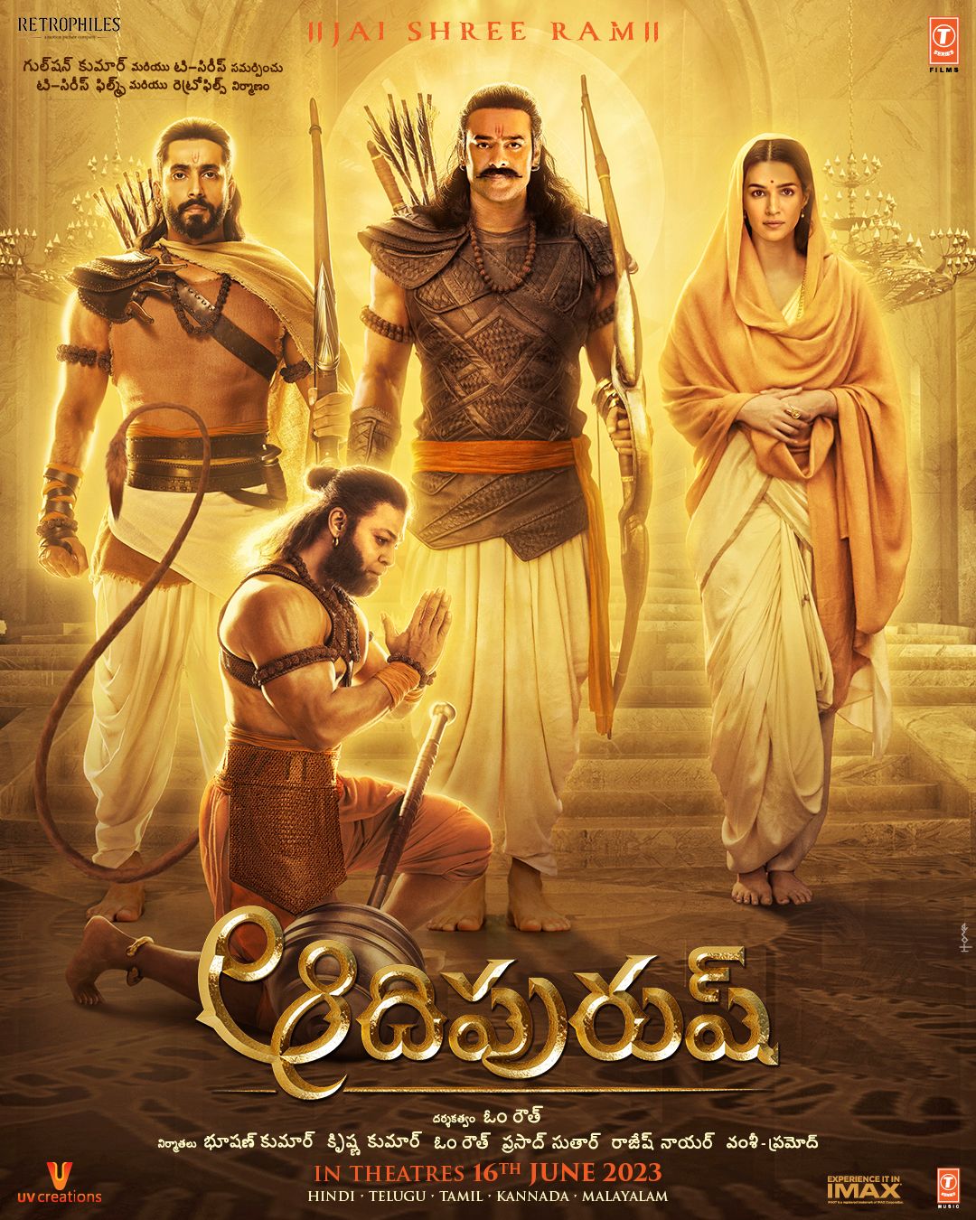 Adipurush, directed by Om Raut is produced by T- Series, Bhushan Kumar & Krishan Kumar, Om Raut, Prasad Sutar, and Rajesh Nair of Retrophiles, Pramod and Vamsi of UV Creations, will be releasing globally on 16th June 2023.
