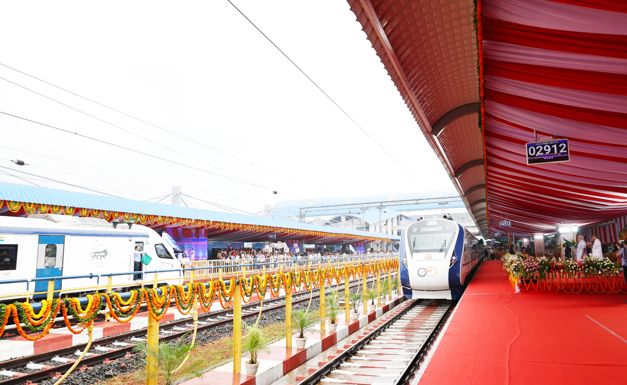 Indian Railways witnessed a historic day today when Prime Minister Shri Narendra Modi flagged off five new & upgraded versions of Vande Bharat Express trains at Rani Kamalapati Station in Bhopal. During this event, Governor, Madhya Pradesh Shri Mangubhai Patel, Chief Minister Madhya Pradesh Shri Shivraj Singh Chauhan, Union Minister for Railways, Communications and Electronics & Information Technology Shri Ashwini Vaishnaw, public representatives and special guests were also present at the venue.