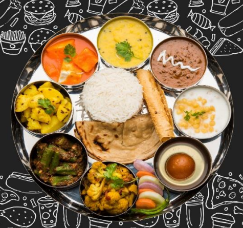 The Indian vegetarian thali is a complete, well-rounded meal typically served on a single plate or tray, containing a variety of dishes that blend diverse flavors and textures. From North to South, East to West, the thali’s components vary depending on the region, but they always feature a range of flavors—sweet, salty, spicy, and tangy. It usually includes: